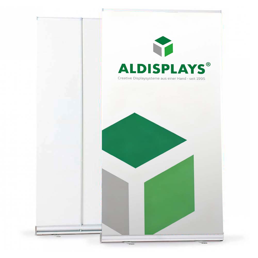 Bannerdisplay RollUp - BASIC - Sichtformat: 1.200 x 2.000 mm - bestehend aus System, Aluminiumstange, - gepolsterter Transporttasche mit Tragegurt, - Digitaldruckbanner 1.200 x 2.160 mm (Poly) - Druck gem. gel. Druckdaten - einzeln verpackt