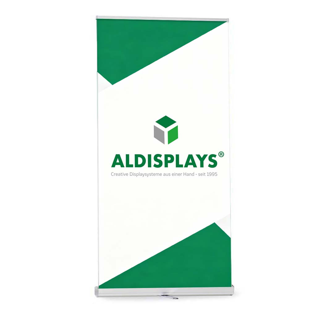 Bannerdisplay RollUp - EVO100 - Sichtformat: 1.000 x 2.200 mm - Verchromte Seiten und Standfuß, Teleskopstange, - gepolsterte Transporttasche mit Tragegurt, - Digitaldruck 1000 x 2360 mm (Greyback PVC-frei B1) - Druck gem. gel. Druckdaten - einzeln verpackt
