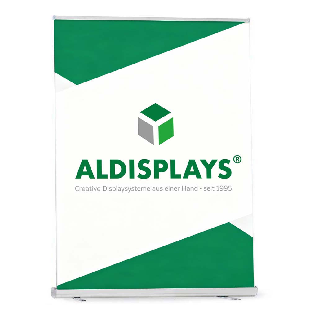 Bannerdisplay RollUp - EVO150 - Sichtformat: 1.500 x 2.200 mm - Verchromte Seiten u. Standfüße, 2 Teleskopstangen, - gepolsterte Transporttasche mit Tragegurt, - Digitaldruck 1.500 x 2.360 mm (Greyback PVC-frei B1) - Druck gem. gel. Druckdaten - einzeln verpackt