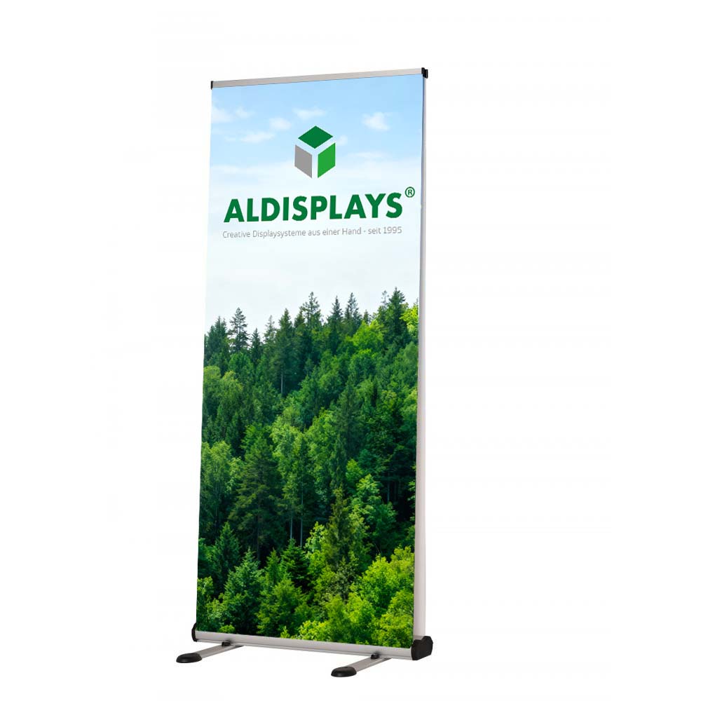 Bannerdisplay RollUp - Outdoor - Sichtformat: 850 x 2.000 mm - Stabiles Aluminium-System mit Federstange, - 2 Füße, Transporttasche und Boden-Heringe, - 2 Digitaldrucke 850 x 2.160 mm (PVC-Plane B1) - Druck gem. gel. Druckdaten - einzeln verpackt