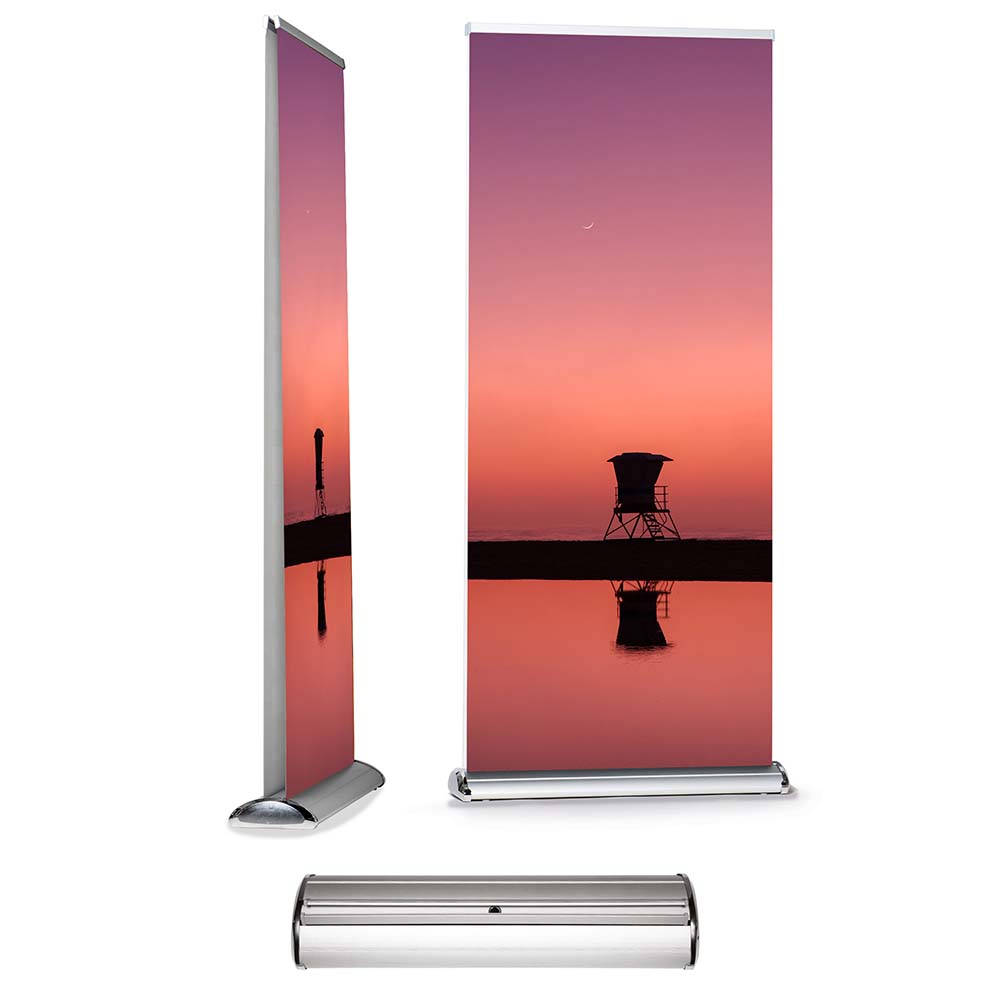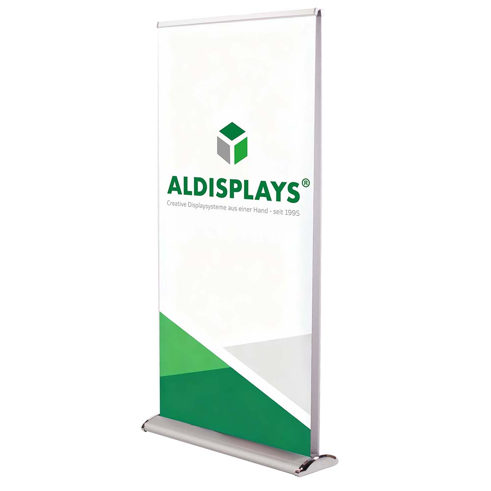 Bannerdisplay RollUp - Design 100 Double - Sichtformat: 1.000 x 2.000 mm - Verchromte Seiten und Standfuß, Teleskopstange, - gepolsterte Transporttasche mit Tragegurt, - 2 Digitaldrucke 1000 x 2160 mm (Greyback PVC-frei B1) - Druck gem. gel. Druckdaten - einzeln verpackt