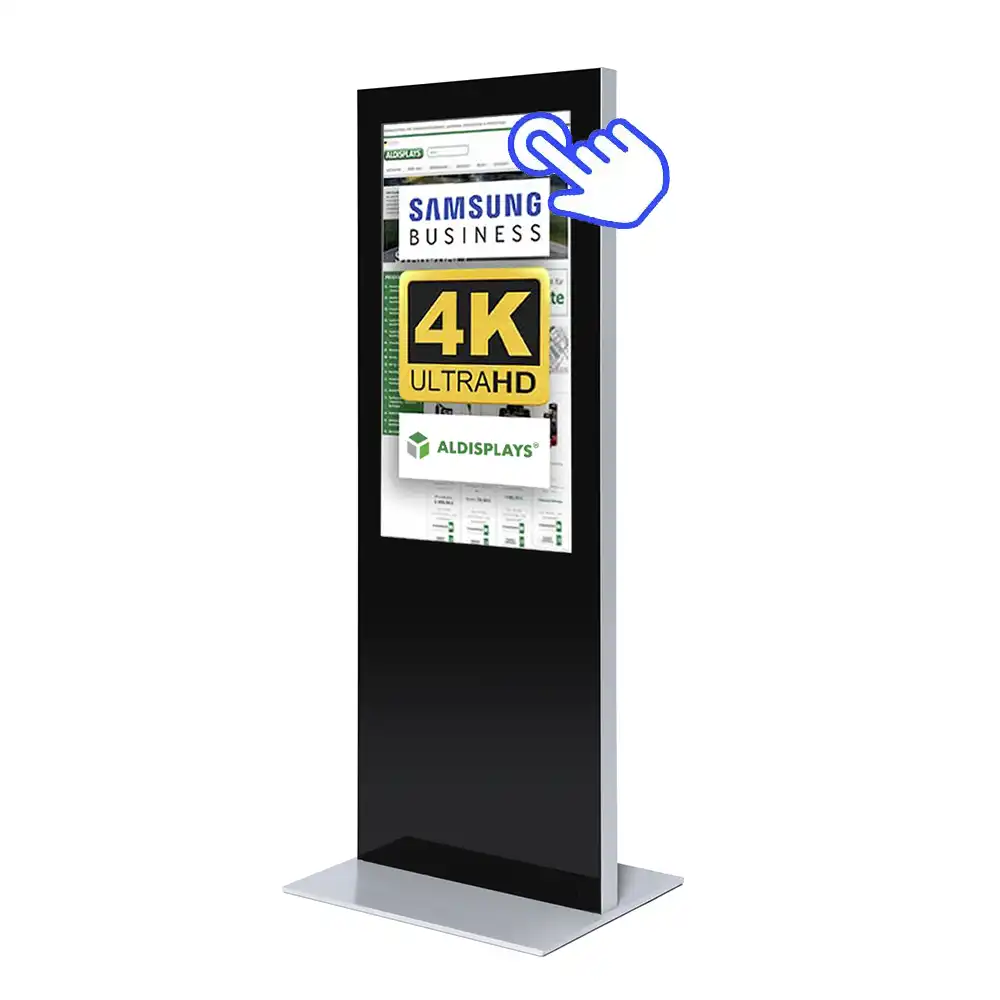 Digital Signage Digitale Info-Stele SLIM Touch - für den Inneneinsatz - Größe: 65 Zoll - 4K UHD - Farbe: silber/schwarz mit Touchfunktion mit 9ms Latenz - & 2-Punkt-Touch - Bautiefe 75 mm - einseitig - incl. Samsung-LED Display für den 24/7-Einsatz - (24 Stunden an 7 Tagen in der Woche)