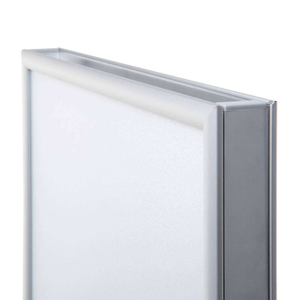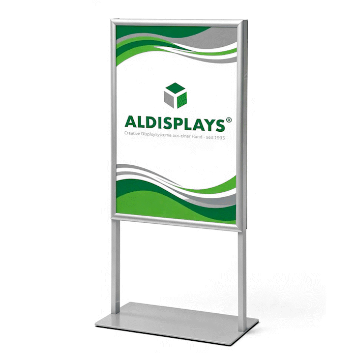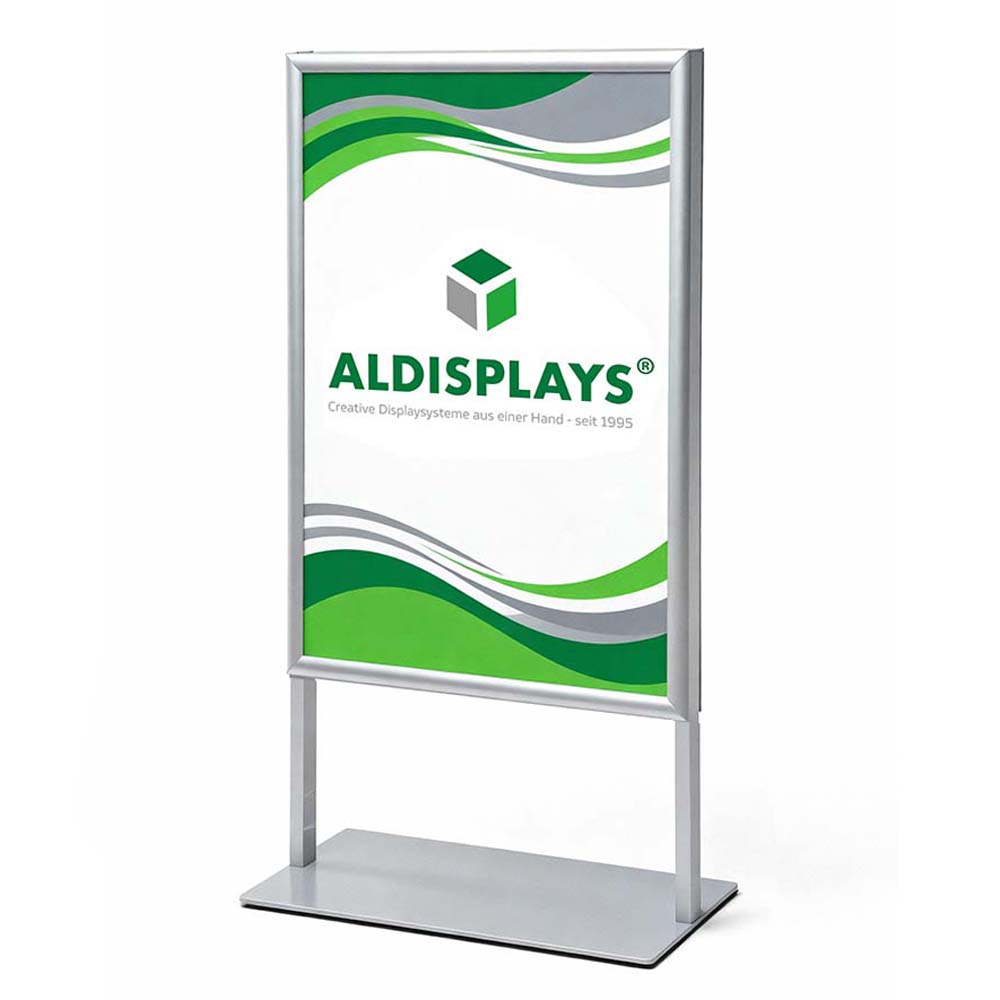 Infoständer DUO – 70x100 cm beidseitig - Gesamtformat: 738 (B) x 1.310 (H) x 33 (T) mm - Posterformat: (2x) 700 x 1.000 mm - Elegante Struktur mit 25 mm Klapprahmen, - schwere pulverbeschichtete Metallbasis für - extreme Stabilität, Farbe: silber