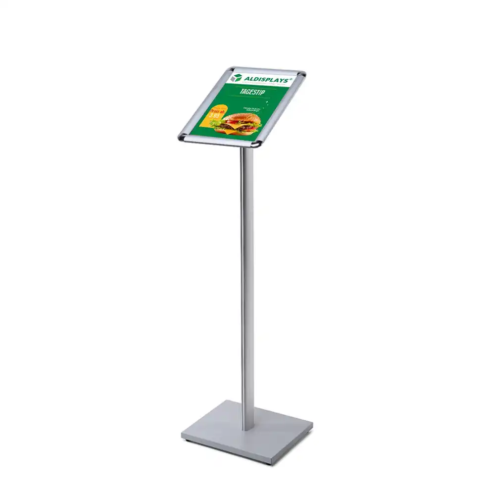 INFOSTÄNDER mit Klapprahmen - im Format DIN A4 (hoch oder quer) - Klapprahmen im 25er Profil Rondo - Farbe: silber-eloxiert (EV1) - Einlegeformat 297x210 mm - Stabile Aluminium-Konstruktion