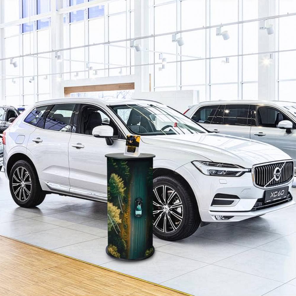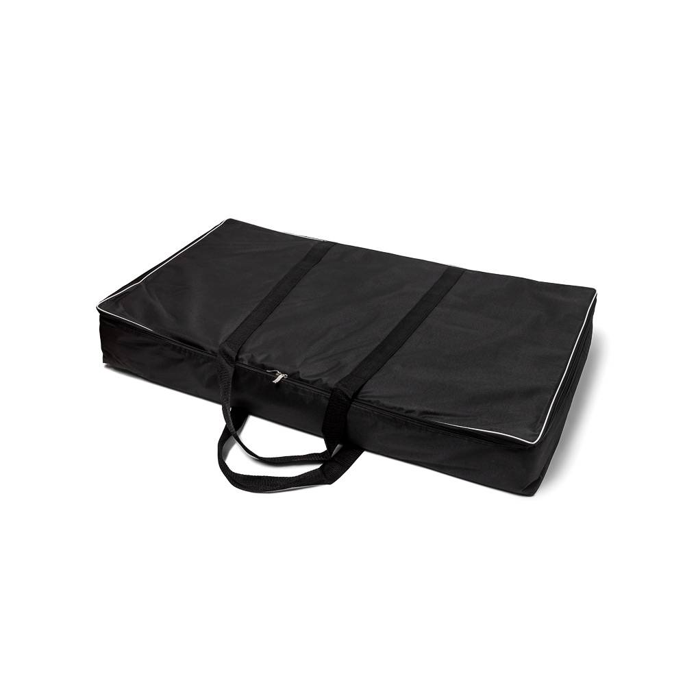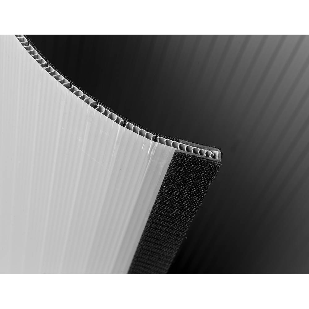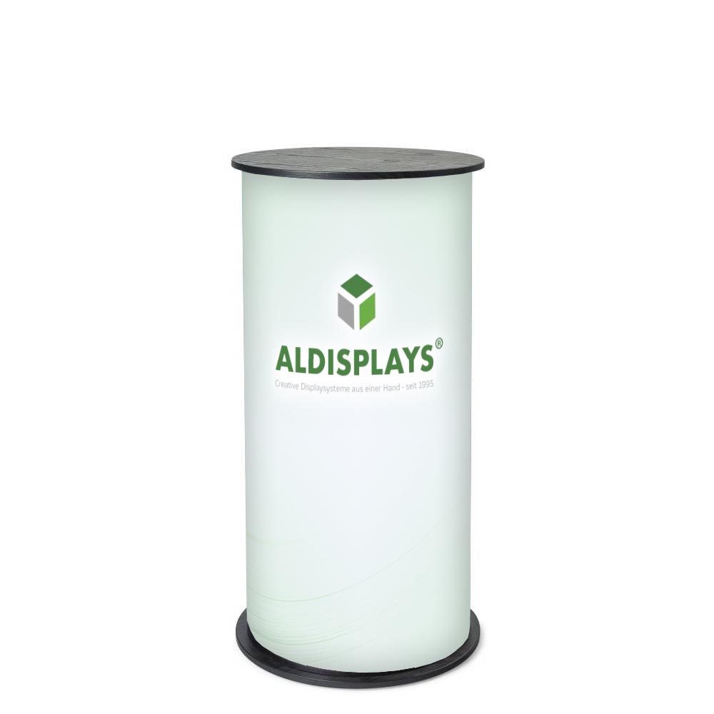 Promotiontheke Counter DESIGN Rund - mit Deckelplatte in SCHWARZ / OHNE Druck - inkl. Transporttasche - mit silberner Kunststoff-Lamellenbahn - Maße: 450 x 930 x 450 mm (BxHxT) - Tragfähigkeit: 45 kg