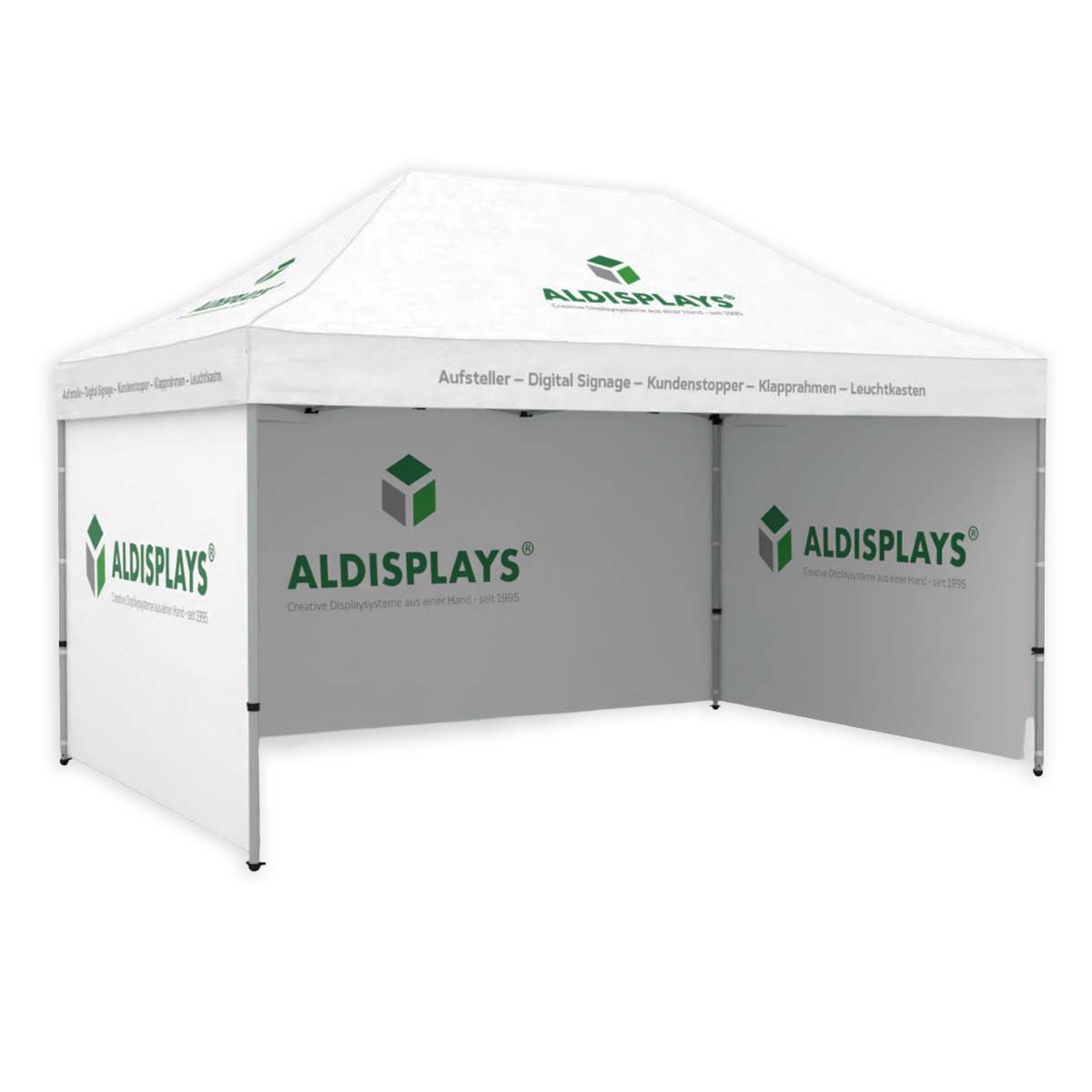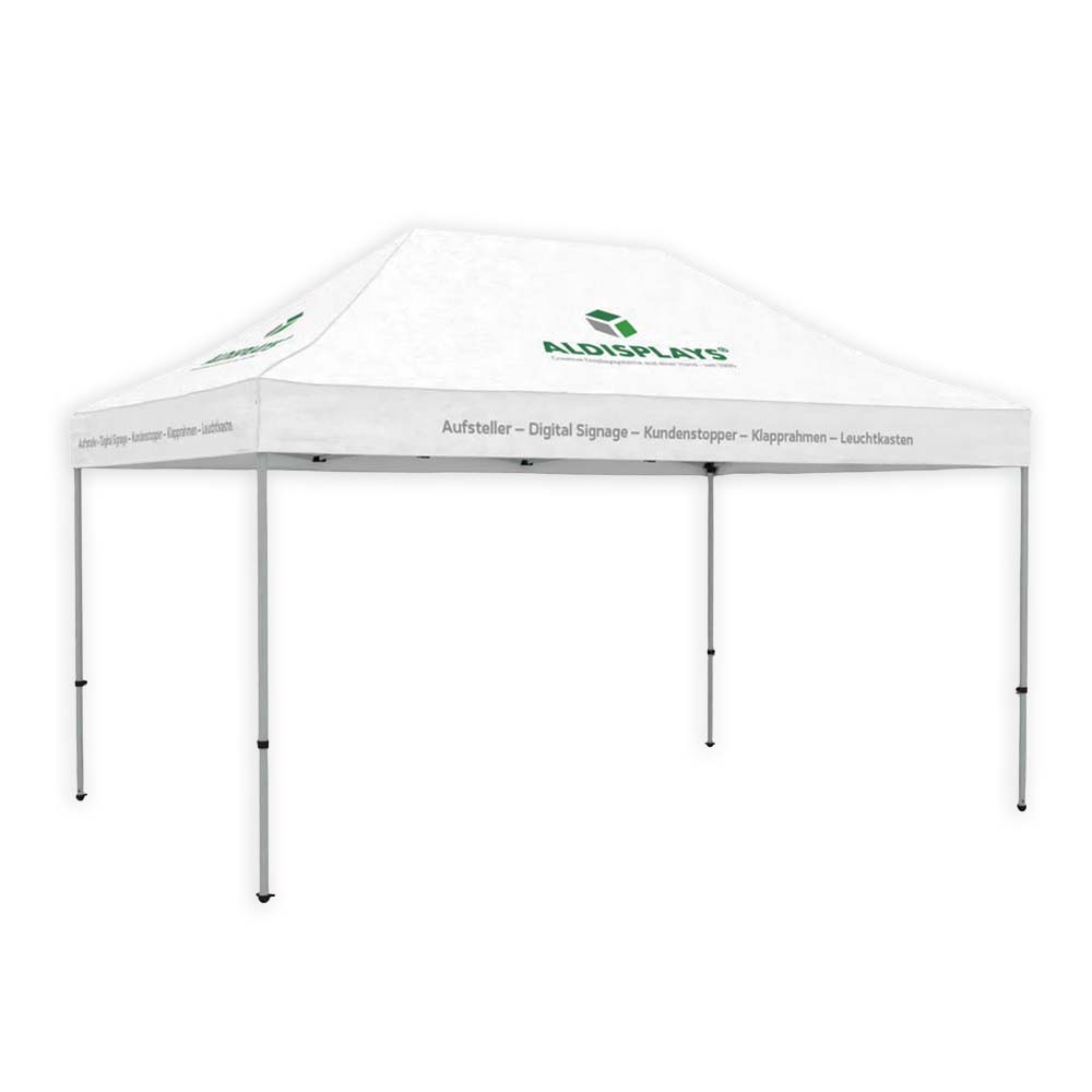 Promotionzelt 4,5x3m mit bedrucktem Dach - Bestehend aus: 4,5x3m Aluminium Gestell, Transport- - tasche mit Rollen, individuell bedrucktes Dach (B1) - Gewicht: 25,5 kg; Format Tasche: 45x164x35 cm - Druck erfolgt auf der Zelt-Aussenseite - Druck gemäß gelierten Druckdaten