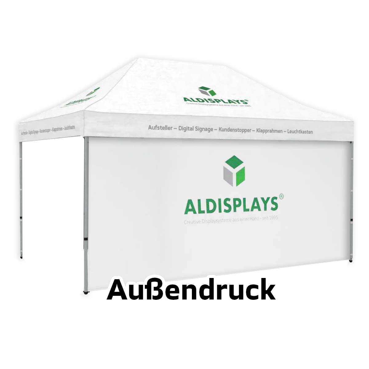 Promotionzelt Seitenwand 4,5m Außendruck - Bedruckte Seitenwand (B1 mit versiegelten Nähten) - mit seitlichen Reissverschlüssen und Klettstreifen, - 4/0 Motivdruck auf der Außenseite - Druck gemäß gelieferten Druckdaten
