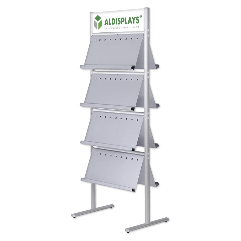 Prospektständer ELLIPSE - Doppelseitig MIT Ablagen - 4x3 - Farbe: silber-elox., mit Forextopper - mit 8 Ablagen aus Metall - für je 3x DIN A4 im Hochformat nebeneinander - mit Topschild 640 x 160mm aus Forex ohne Druck